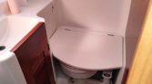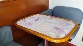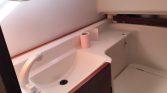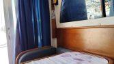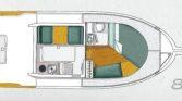 Interior: Cabine com mesa de refeições rebatível com Bancos em ambos os lados, Móvel com Fogão (por estrear), Lava loiças e Frigorifico. Piso inferir: Cabine à proa com uma cama de casal, roupeiro e um WC com sanita marítima, Lavatório e chuveiro.